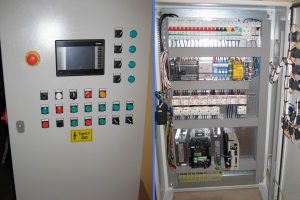 250 kW-os indukciós hevítő gép vezérlésének elektromos tervezése, vezérlés elkészítése, felprogramozása, OMRON CP1L PLC, R88D szervo, MX2 frekvenciaváltó felhasználásával.